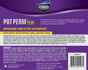 Pot-Perm Plus is a strong oxidizing agent that converts dissolved iron and/or manganese to insoluble oxides which can easily be removed through filtration. Pot Perm Plus regenerates and oxidizes greensand iron filter media, restoring the exchange capacity of the unit.